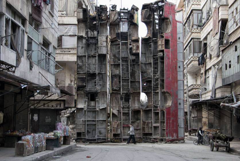 In the Time Magazine top 100 images of the year, A young boy walks past a makeshift barricade made of wreckages of buses to obstruct the view of regime snipers and to keep people safe, in the rebel-held side of the northern Syrian city of Aleppo. March 14