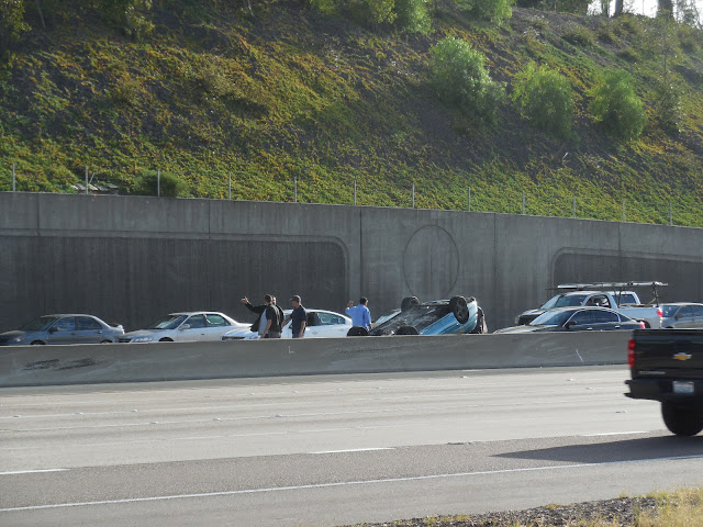 From what I can figure, someone had just tried to go from the slow to the fast lanes, and found that traffic was changing velocity unexpectedly, and hit the back of this truck, then the updide down car struck the center divider and rolled over, luckily it wasn't struck from behind