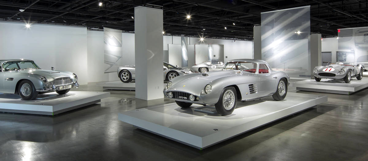 Among the new Petersen’s many opening exhibits. "Precious Metal" features 10 beautiful silver cars on silver stands in a silver room with a silver backdrop.